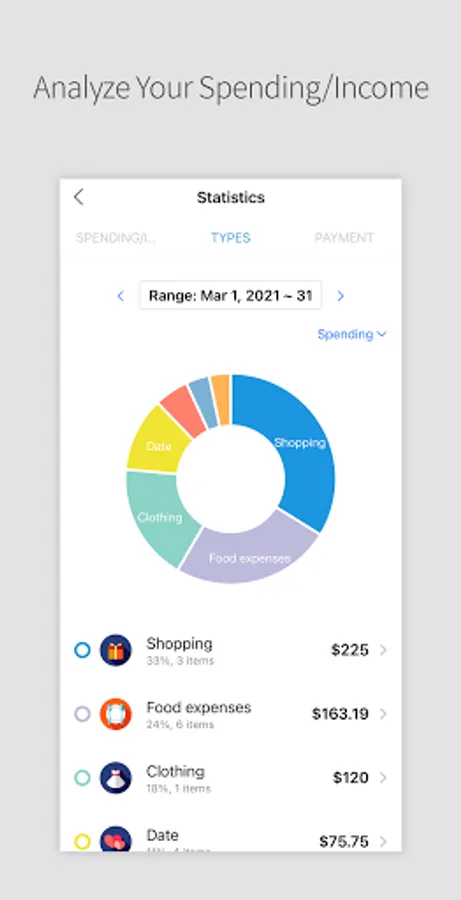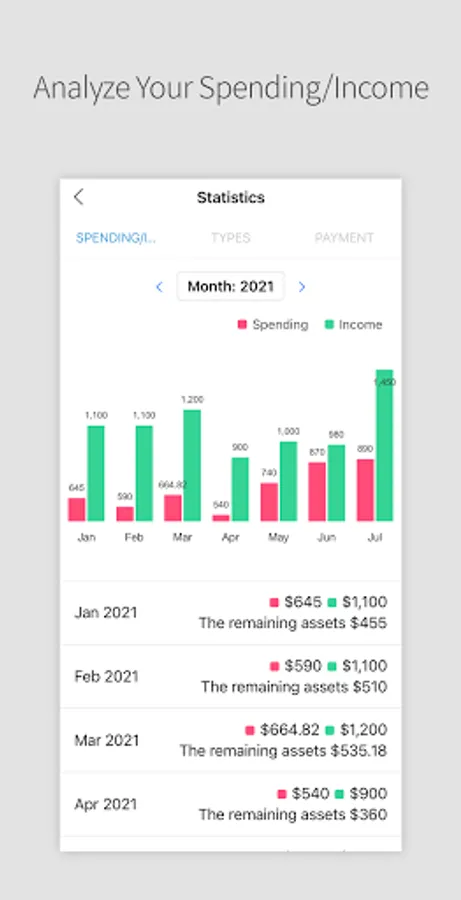 Supporting the various types of charts about spending/income ( total/a 1-year basis/a 6-month basis/a 1-month basis )