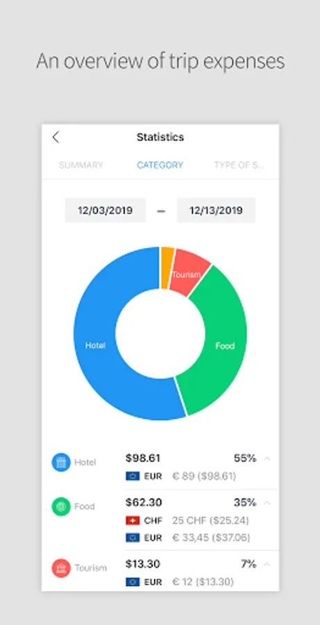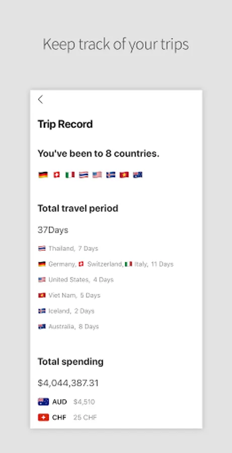 - Check all countries, period, and expenses of your trips