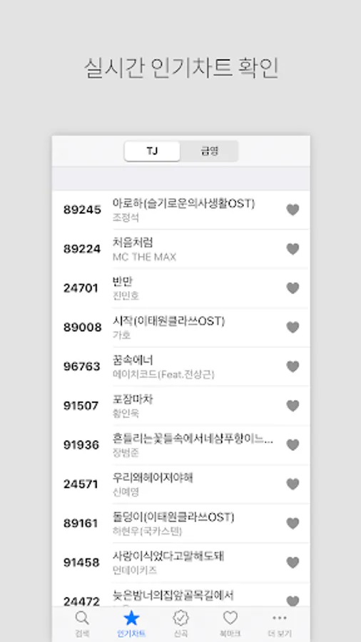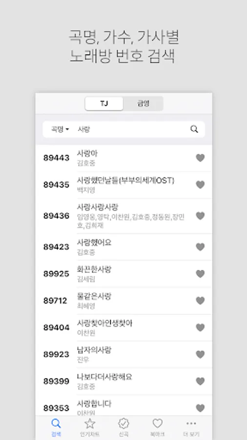 ● TJ, Geumyoung karaoke number search function by title, singer, number, lyrics