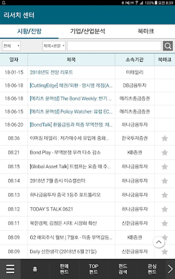 * News/Research: Domestic and overseas news, research center, personal information search, domestic economic schedule, stock market schedule information by country