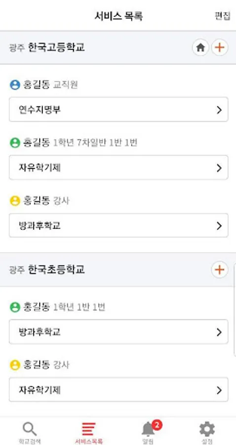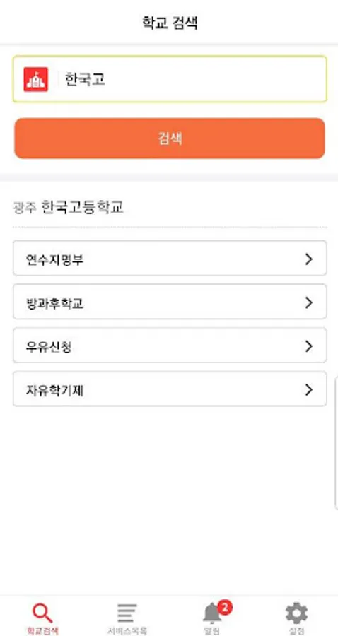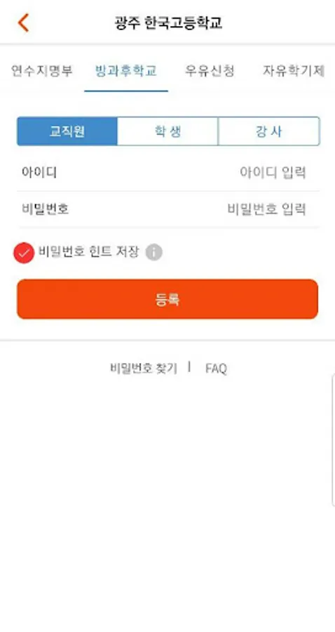 서비스 계정 등록 후 자동 로그인 되어 방과후학교 수강신청, 자유학기제 수강신청, 우유 신청, 연수지명부 서비스를 이용할 수 있습니다.