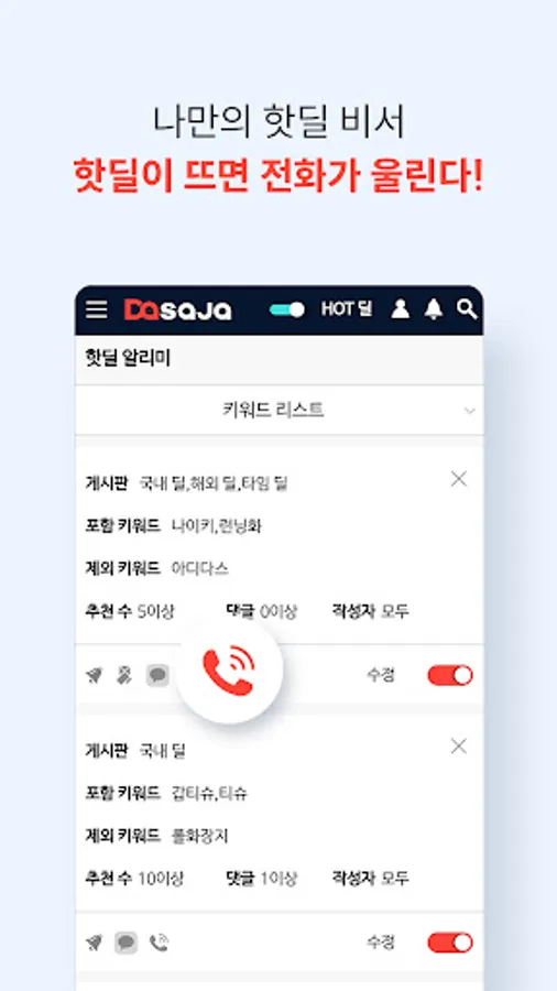 Catch hot deal information from domestic shopping malls (11th Street, Gmarket, Auction, Naver Smart Store, WeMakePrice, Timon, Coupang, etc.) and overseas shopping malls (Amazon, eBay, Ali Express, Taobao, etc.) faster than anyone else!