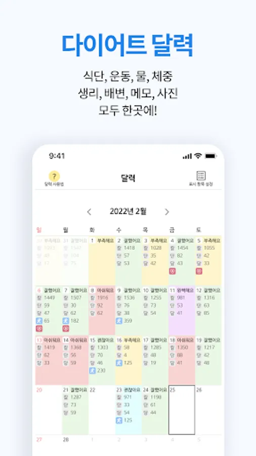 - You can check calories, nutrients, exercise, water, weight, menstruation, bowel movements, memos, and even eye body on the calendar.