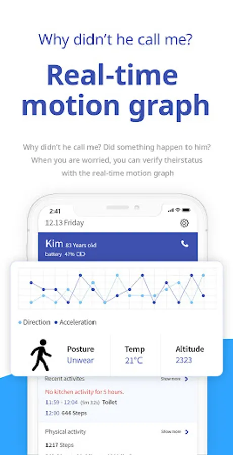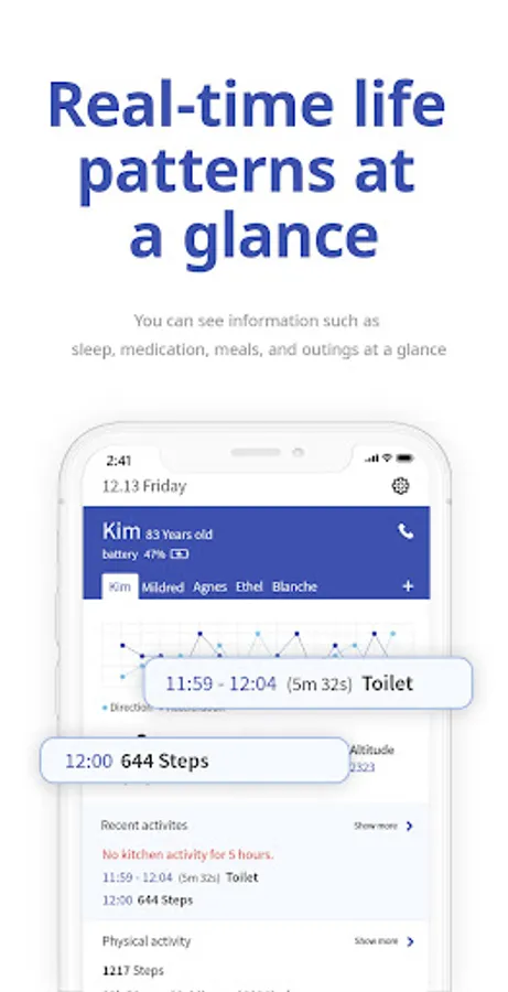 The TouchCare watch features automatic fall detection and includes a simple-to-activate emergency alert button that informs caregivers in times of critical need. Physical activity is monitored via step count, step speed, and stride length data. GPS data can also be obtained, showing a user’s current location and also their historical journey data.