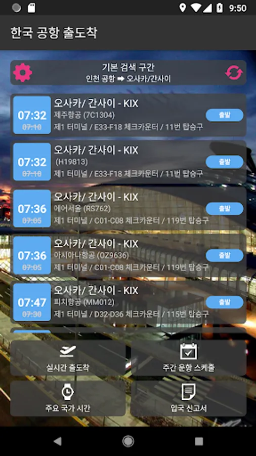 You can check the arrival and departure information for domestic and international flights at all airports in Korea and check weekly schedule.