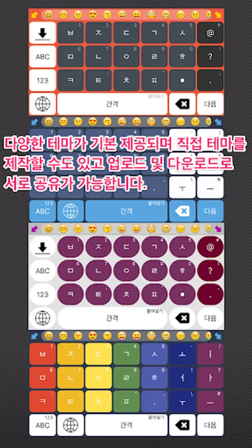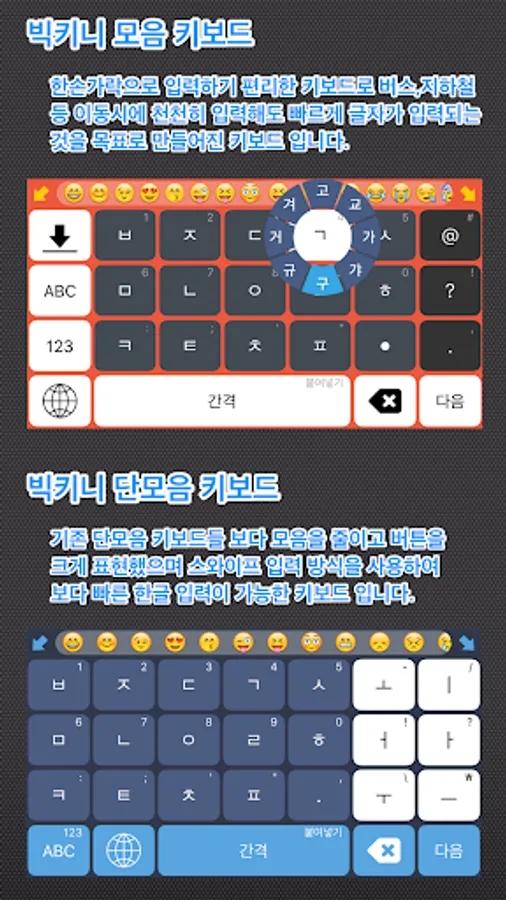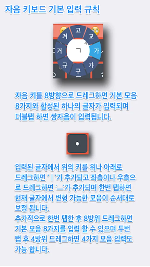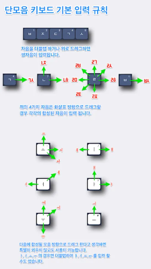 Consonant keyboard is an innovative keyboard that only the consonants on the keyboard layout of the keyboard is primarily a way to enter into a non-swipe touch. Even slower because the input was made on the one hand, Hangul input vowels and consonants the way to the bus, subway or transit is convenient to enter at the same time it reduces the number of input characters is an average of 25 percent faster output. For example, if the default keyboard keyboard 400 times consonant with the national anthem 1-4 inputs can be entered in this section if you can get the same results with only input of less than 300 times.