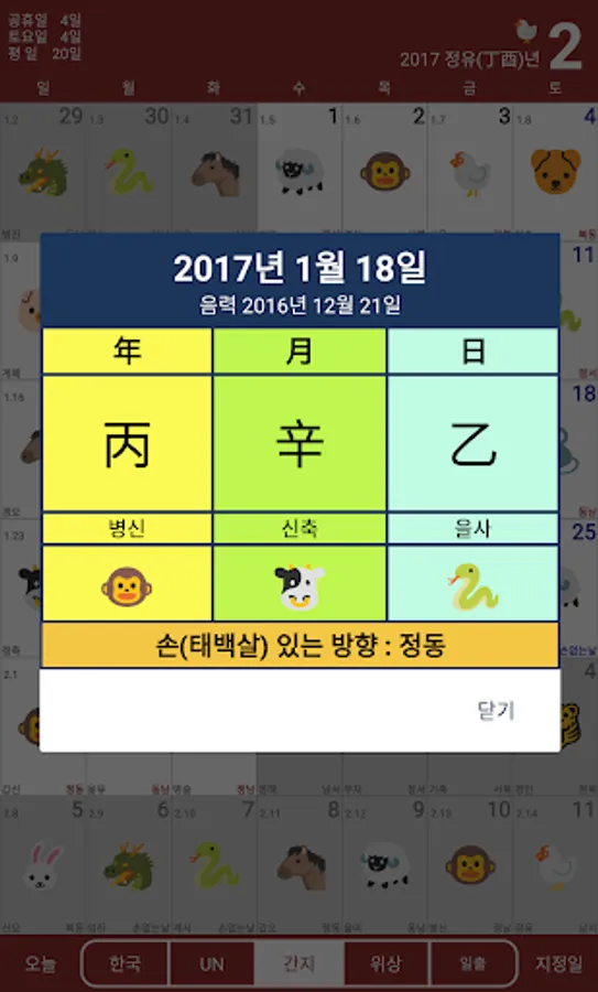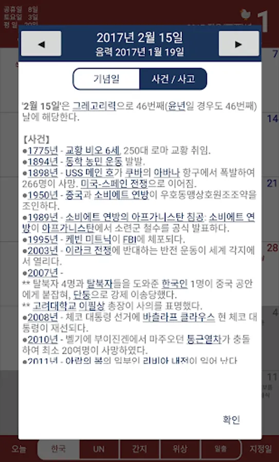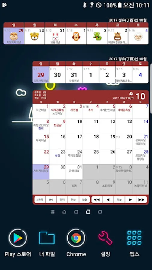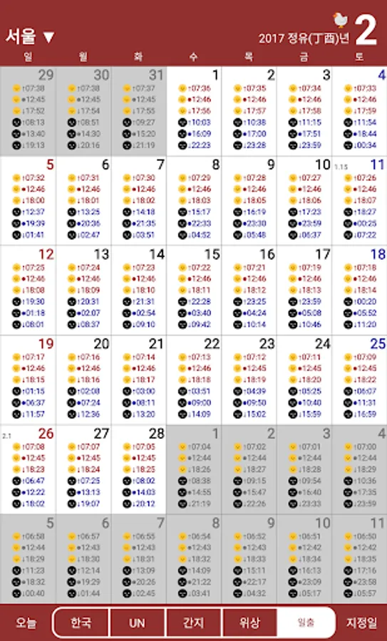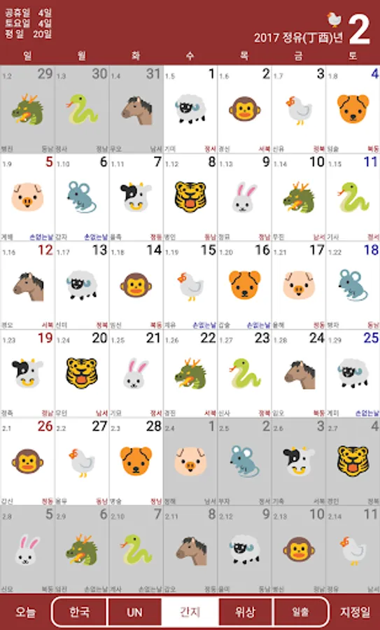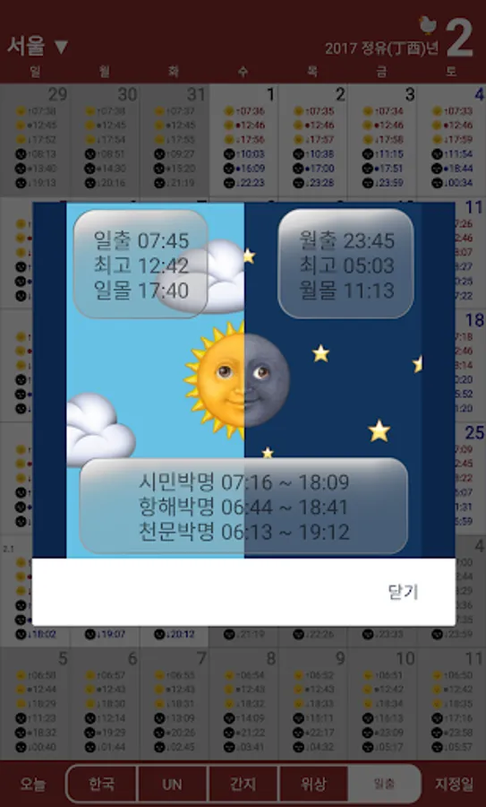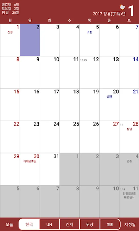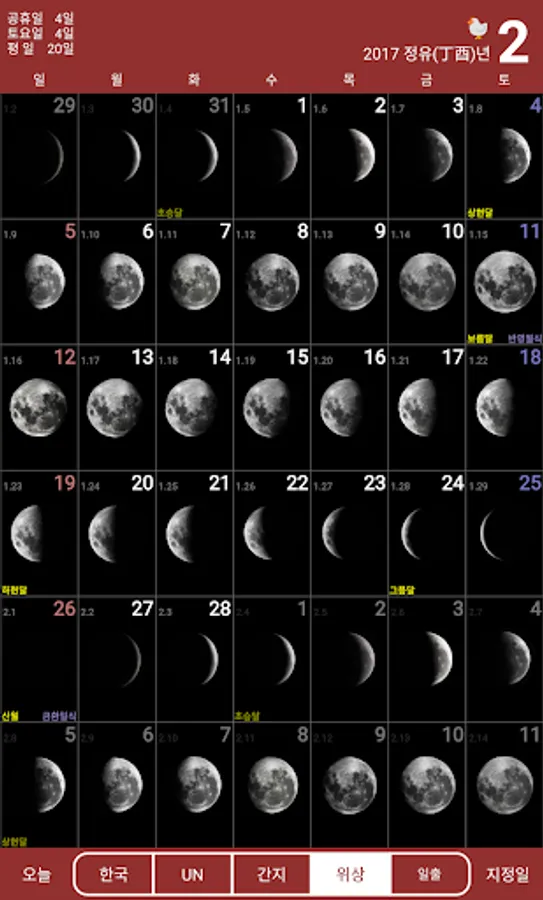 Korea calendar contains a calendar to a variety of phases, sunrise / sunset calendar's default calendar, as well as UN Day, kanji, moon.