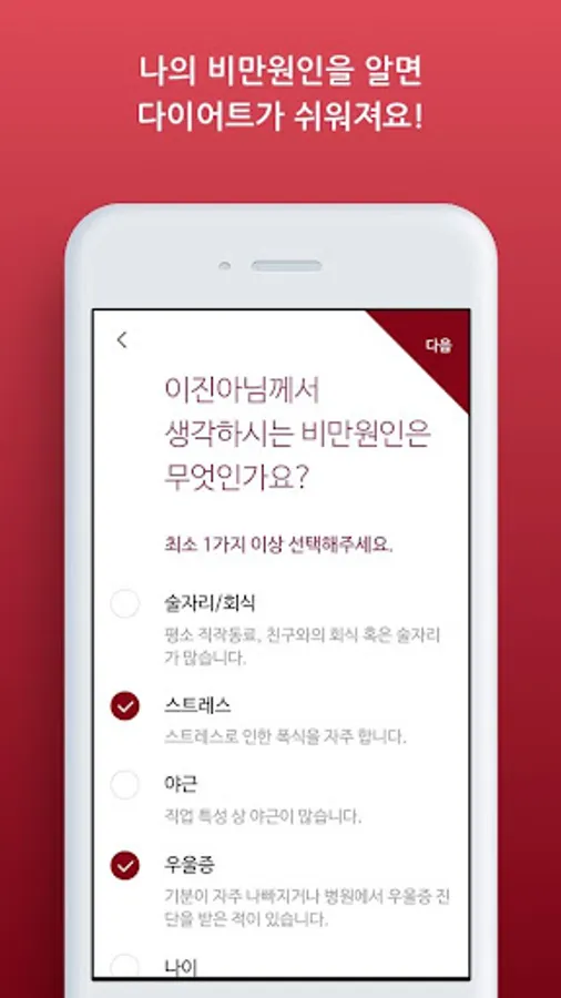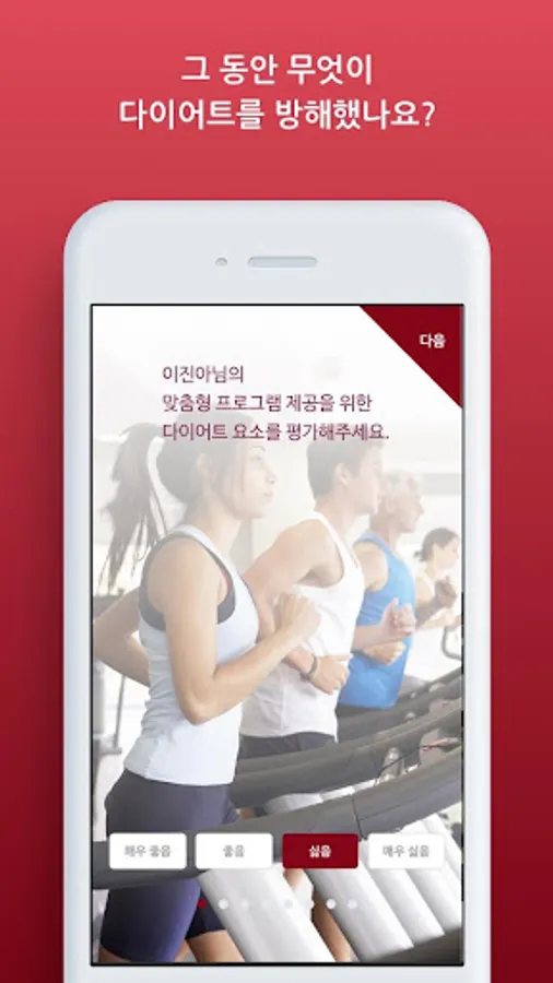 - 사용자는 건강관리 프로그램을 실행하기 전 다이어트에서의 스트레스 요인을 기호에 따라 4단계로 평가합니다.