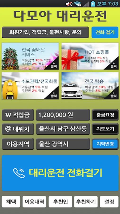 * 다모아대리운전은 대리운전 뿐만 아니라 꽃배달 , 휴대폰 구입도 가능하시며 이용시 일정의 적립금을 드리는 적립식 어플입니다.