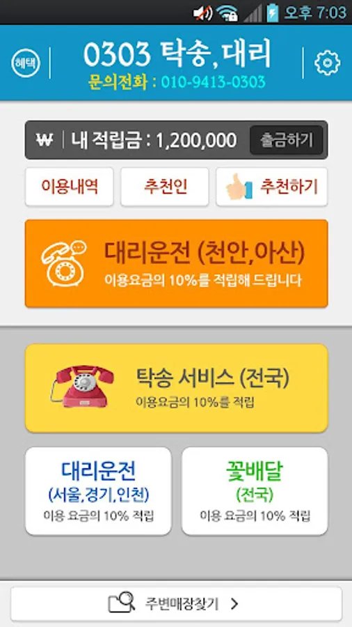 * 대리운전은 천안, 아산지역에서 이용가능합니다. 이용시 이용금액의 10% 적립해드립니다.