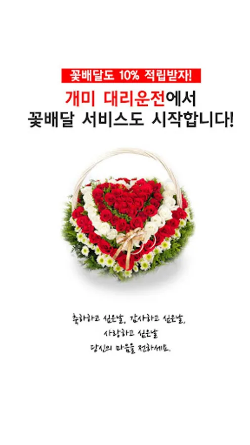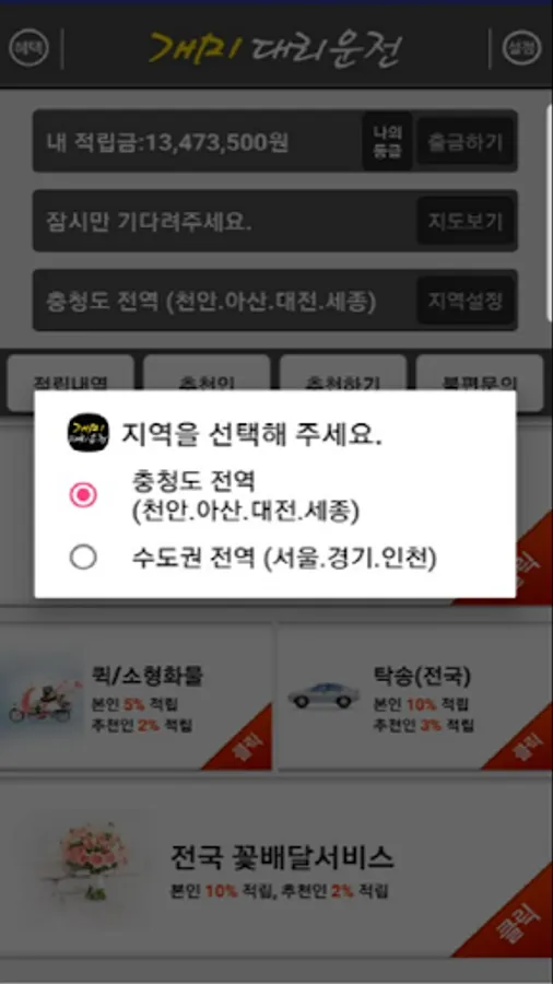 * 대리운전,꽃배달,퀵서비스,탁송을 이용하시면 이용시마다 현금적립(본인/추천인) 해드립니다.