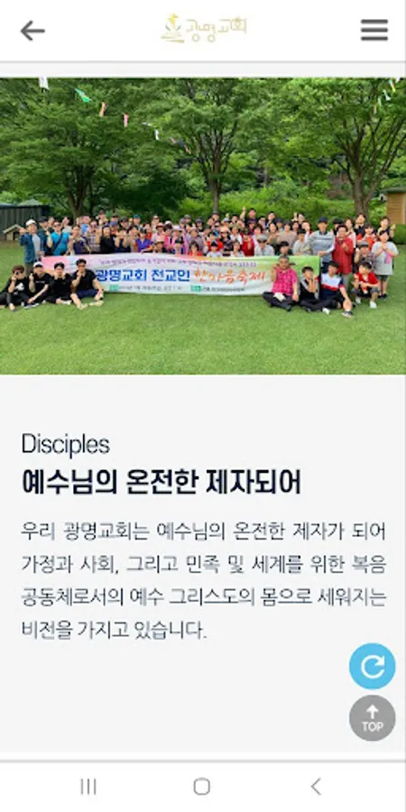 Our Gwangmyeong Church has a vision to become a complete disciple of Jesus and to be established as the body of Jesus Christ as a gospel community for the family, society, nation and world.