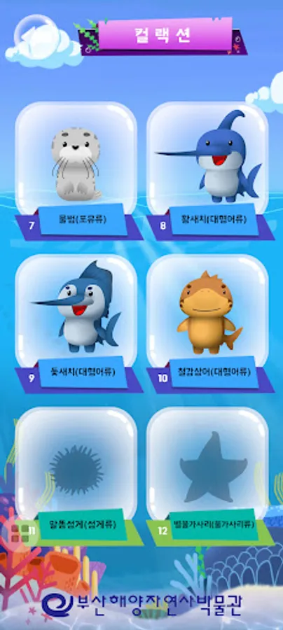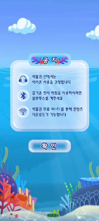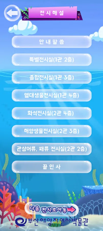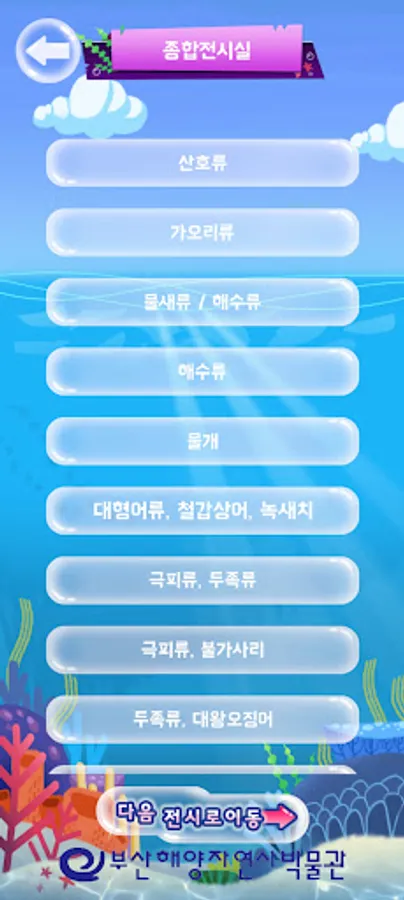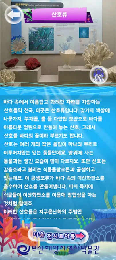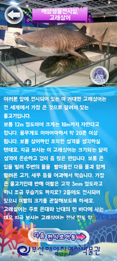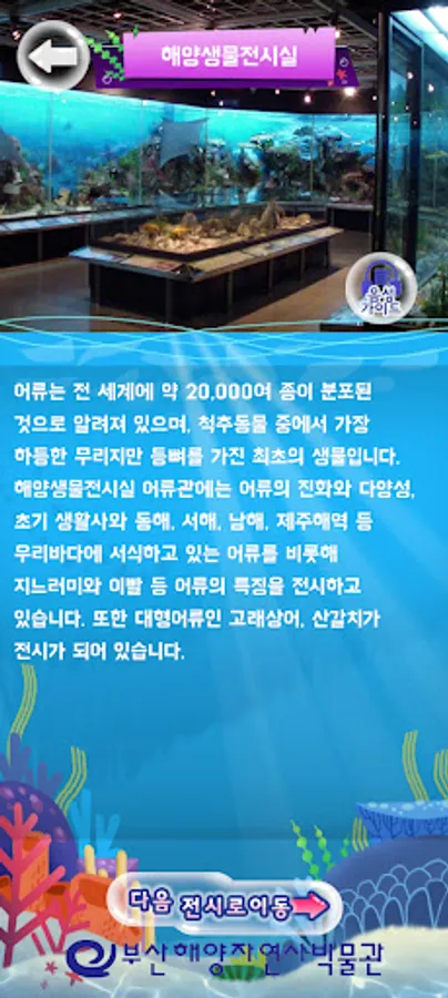 백상라리 캐릭터인 아리와 함께하는 살아있는 해양탐험 앱은 해양자연사박물관 내 생물 전시물에