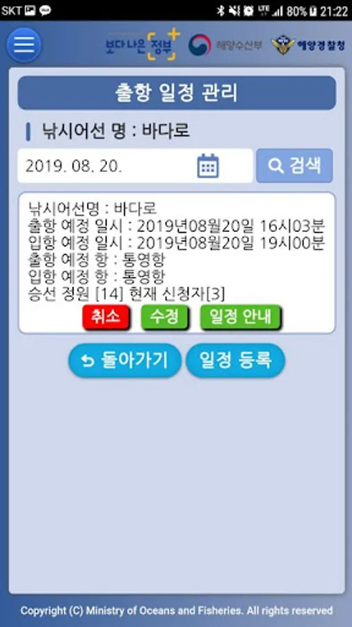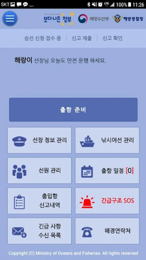 Fishing Sea The Sea of Fishing conducted a demand survey on the establishment and advancement of the fisheries field system as part of the 2nd construction project for the fisheries information integration system of the Ministry of Oceans and Fisheries in '18, and collaborated with the Income Welfare Division and the Fisheries Resource Policy Division. It is a service app for providing convenience of fishing boat embarkation report management and prevention of marine safety accidents through, and support for rescue activities of the people of disaster prevention organizations.