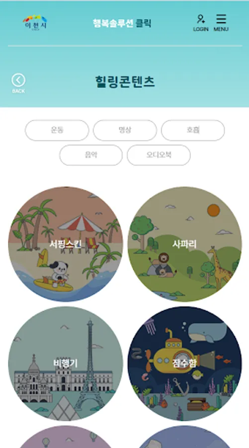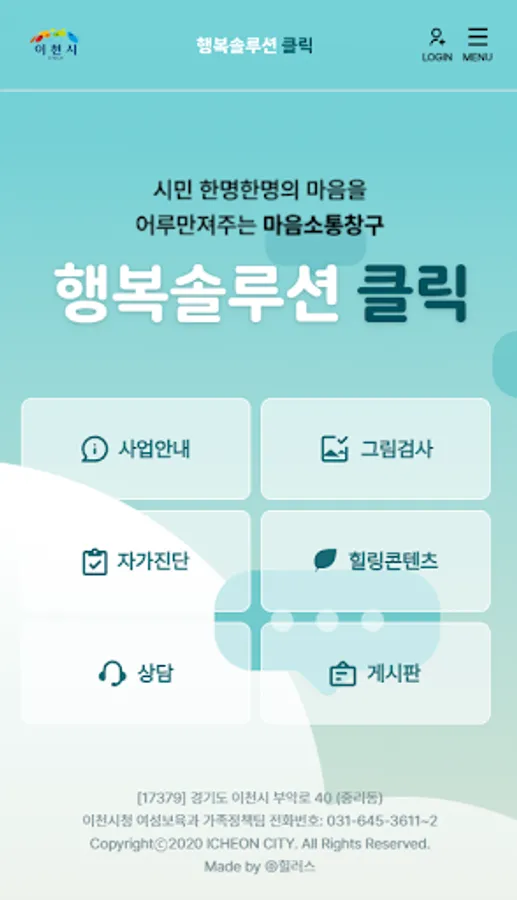 It is a free online service that allows citizens of Icheon to receive professional counseling and healing contents for all of you (depression/anxiety, childbirth/parenting, psychological/generational conflict, exercise, youth) on PC or mobile with one click.