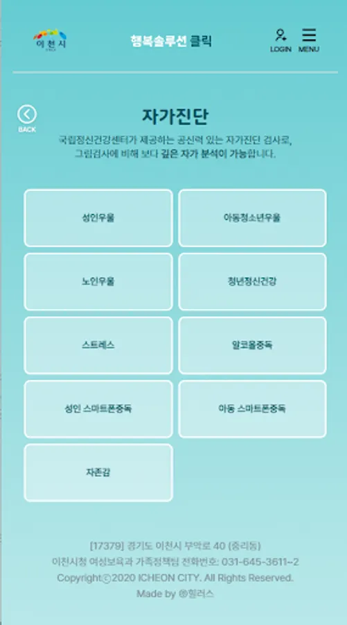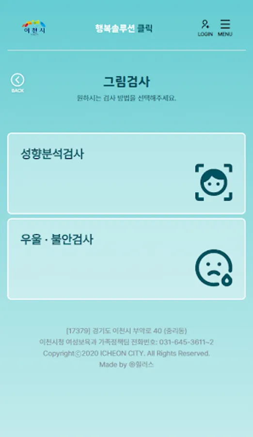 1. Icheon City Happiness Solution Click provides the user's status through a questionnaire, but cannot replace the doctor's diagnosis.