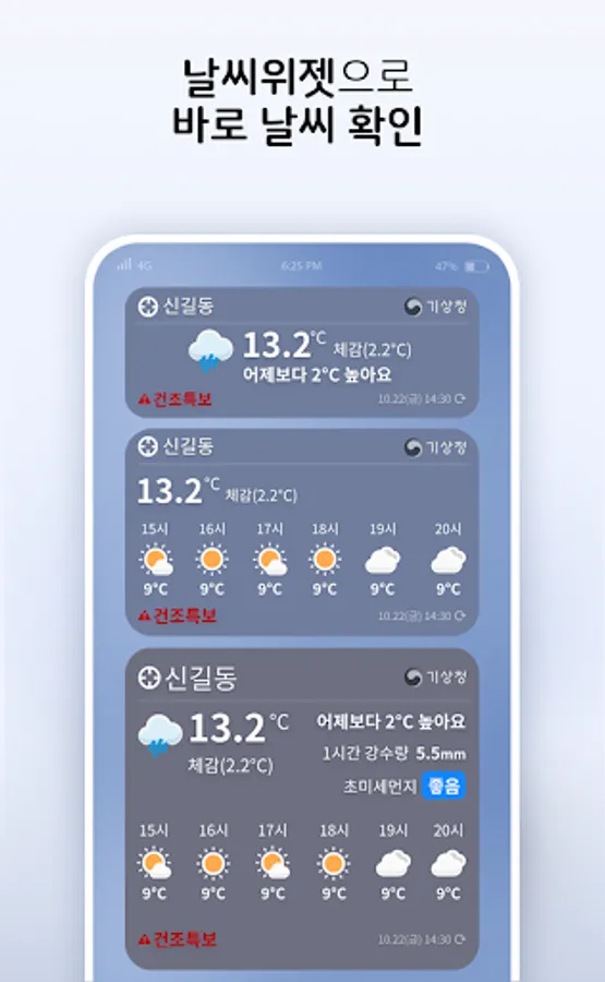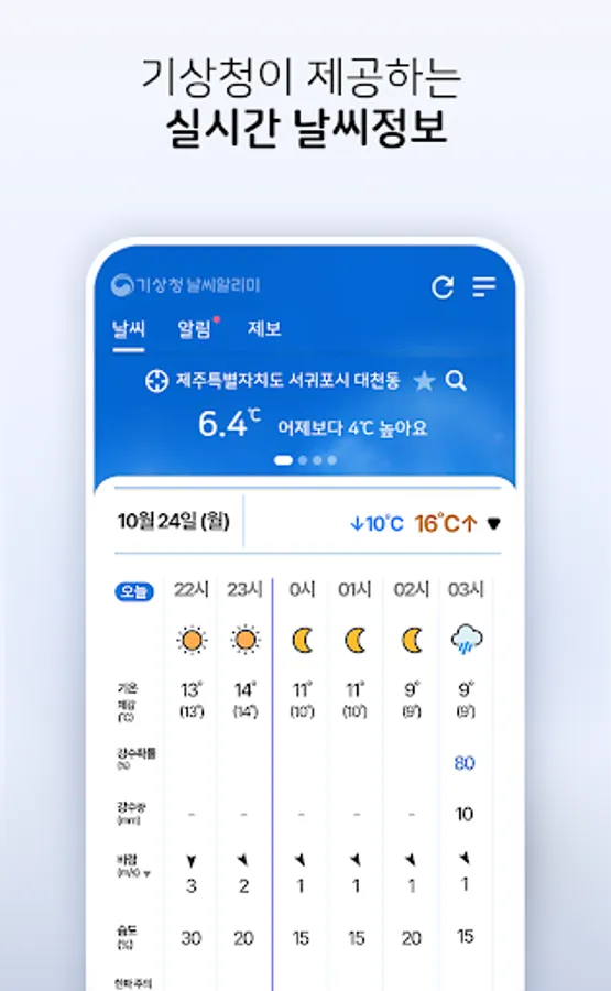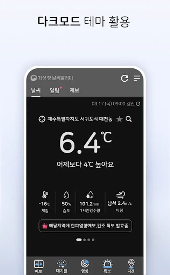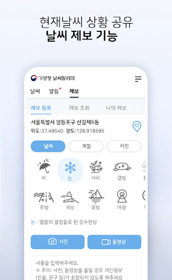 The weather alert provided directly by the Korea Meteorological Administration is a customized notification service that notifies dangerous weather information such as earthquakes and special weather reports based on the user's location.