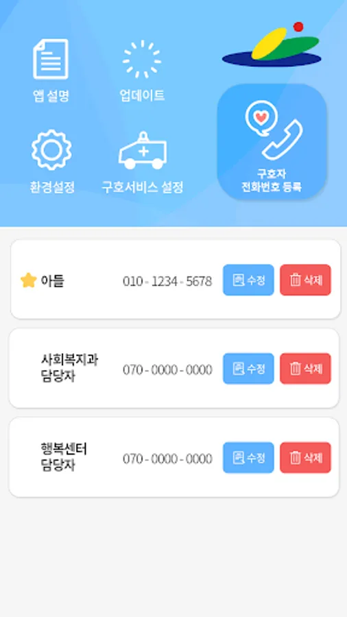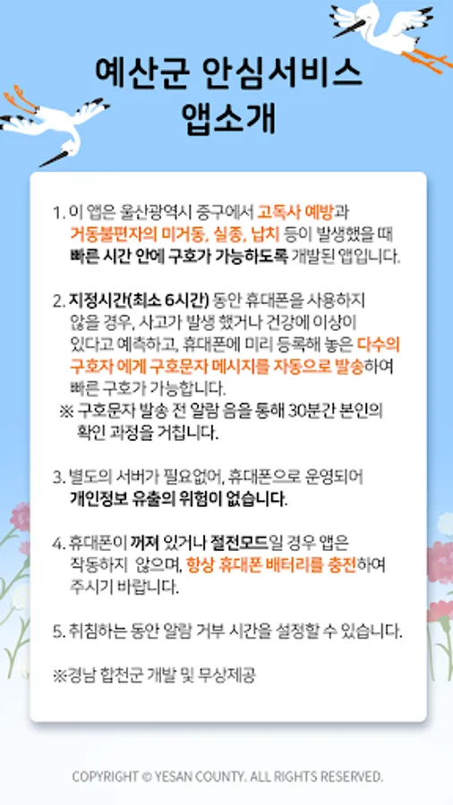 This app is for the elderly 65 years of age or older, the disabled, dementia patients, severely ill, single-person households, kindergarteners, elementary, middle and high school students, etc., who do not use their mobile phones for at least 12 hours when they do not use their mobile phones for at least 12 hours. It is a relief service app developed to prevent damage by sending texts or warnings (sound, vibration, etc.) to