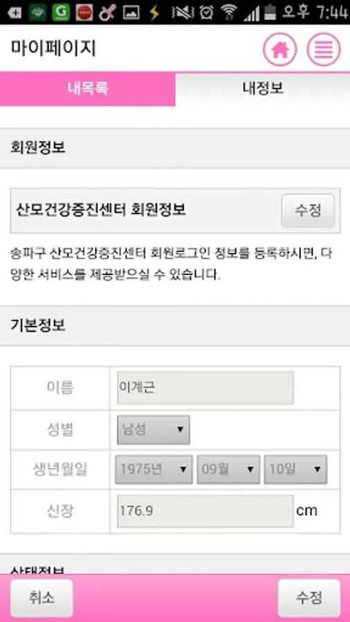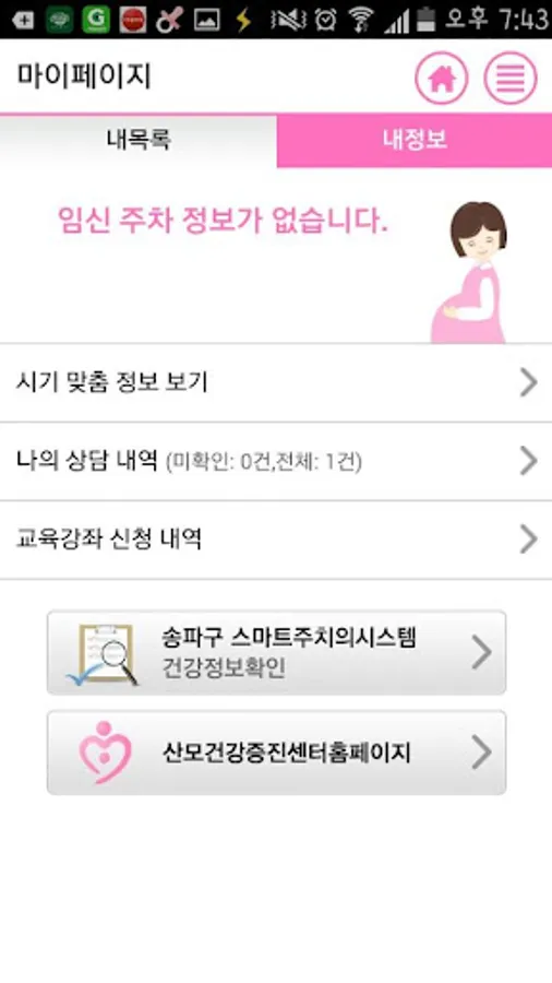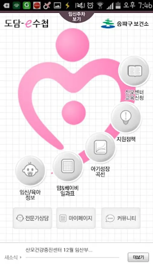 Songpa maternal health center members childbirth targeted subscribers from prenatal care, child care, providing information related to maternal and child health leading to management in an integrated and Songpa-gu Health Center Maternal and child health professionals access to pregnancy / parenting counseling services available for smart phones you can.