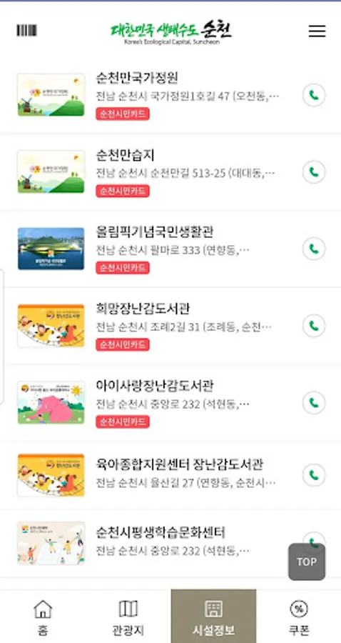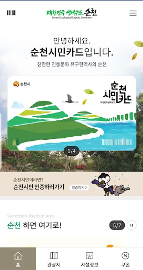 - 모바일 순천시민카드로 여러 시설의 회원으로 인증 받을 수 있습니다.