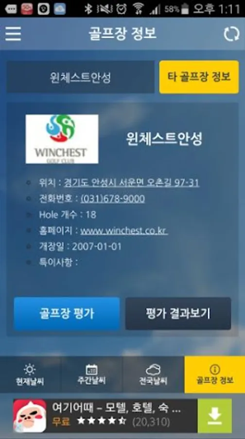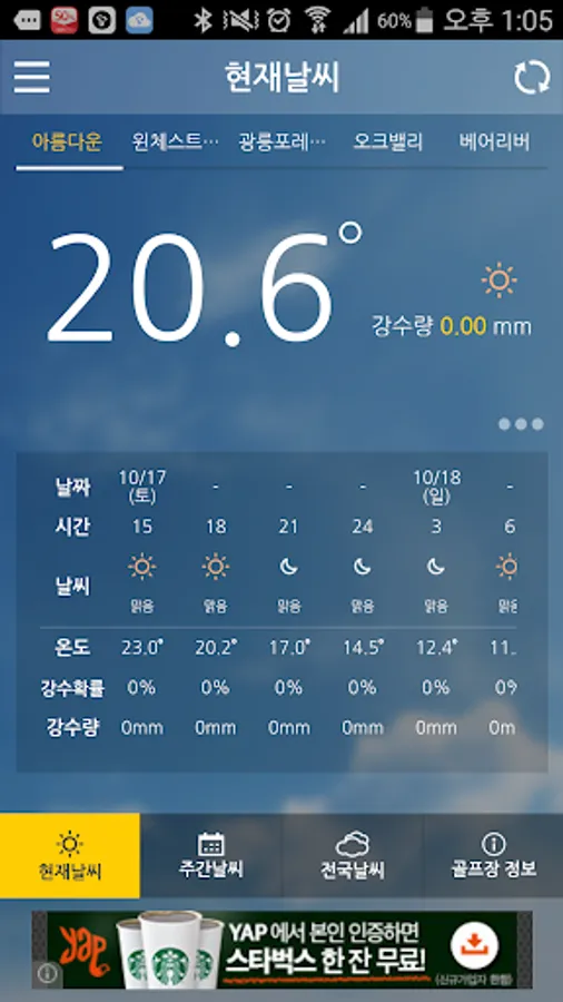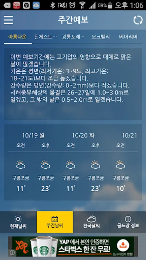 즐겨찾는 골프장을 최대 5개까지 등록하여 시간대별 날씨, 주간날씨, 전국날씨를 관측할 수 있습니다.