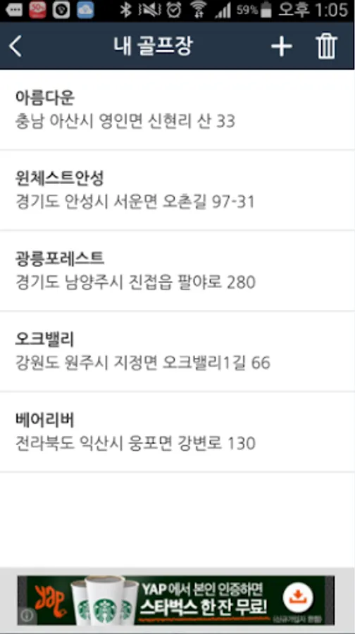 원하는 골프장을 쉽게 검색하여 홈페이지, 홀수, 전화번호, 주소 검색이 가능합니다. 자주 찾는 골프장은
