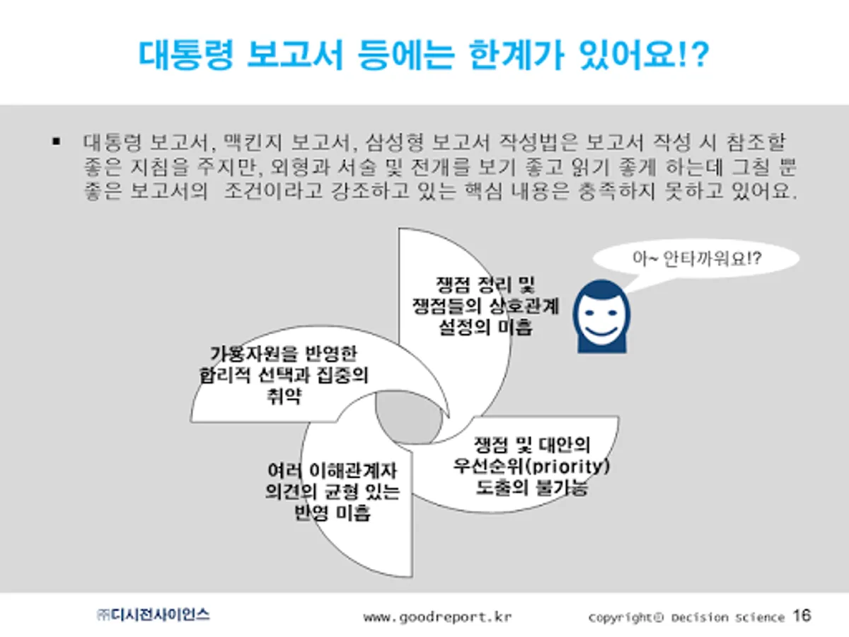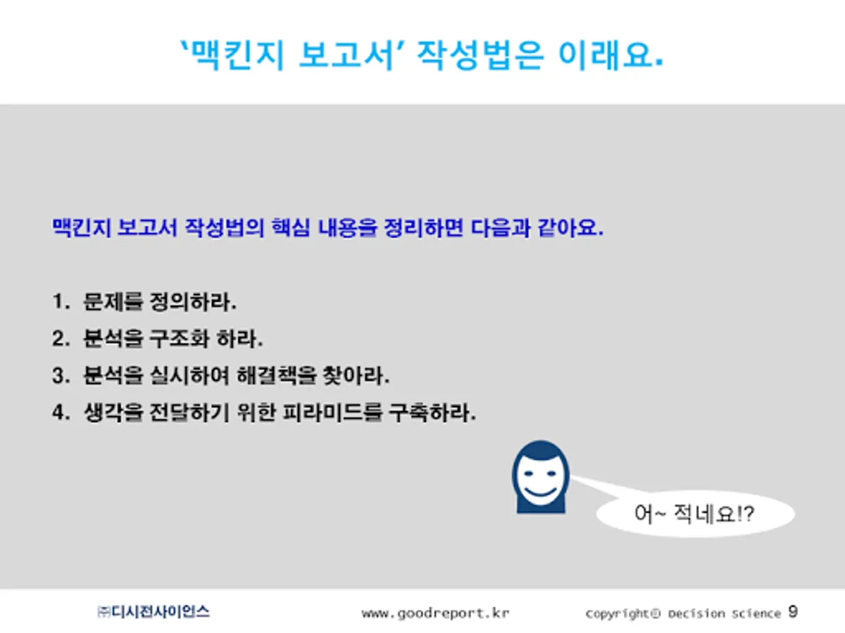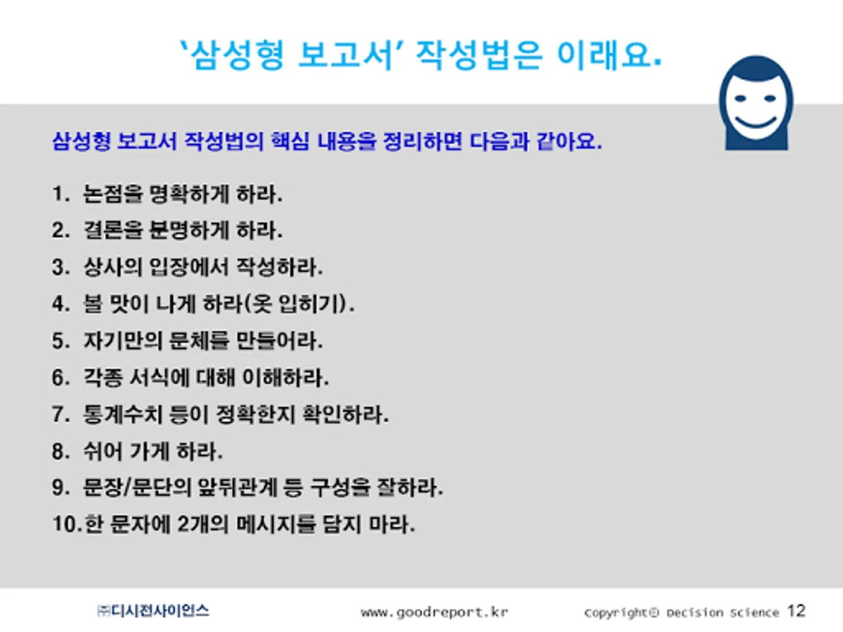 대통령 보고서, 맥킨지 컨설팅 보고서, 삼성형 보고서 등 대표적인 보고서작성법 들의 핵심 내용을 한눈에 살펴볼 수 있습니다. 나아가 ‘과학적 보고서 작성법’을 익혀 한 차원 높은 보고서를 작성하여 칭찬도 받고 성과도 높일 수 있도록 지원합니다. 직장인 여러분, 힘내세요!
