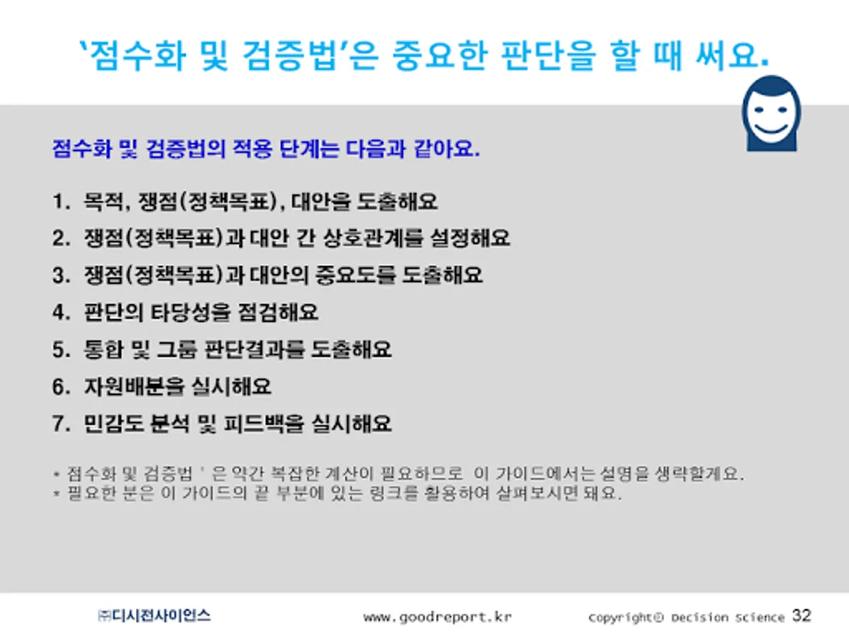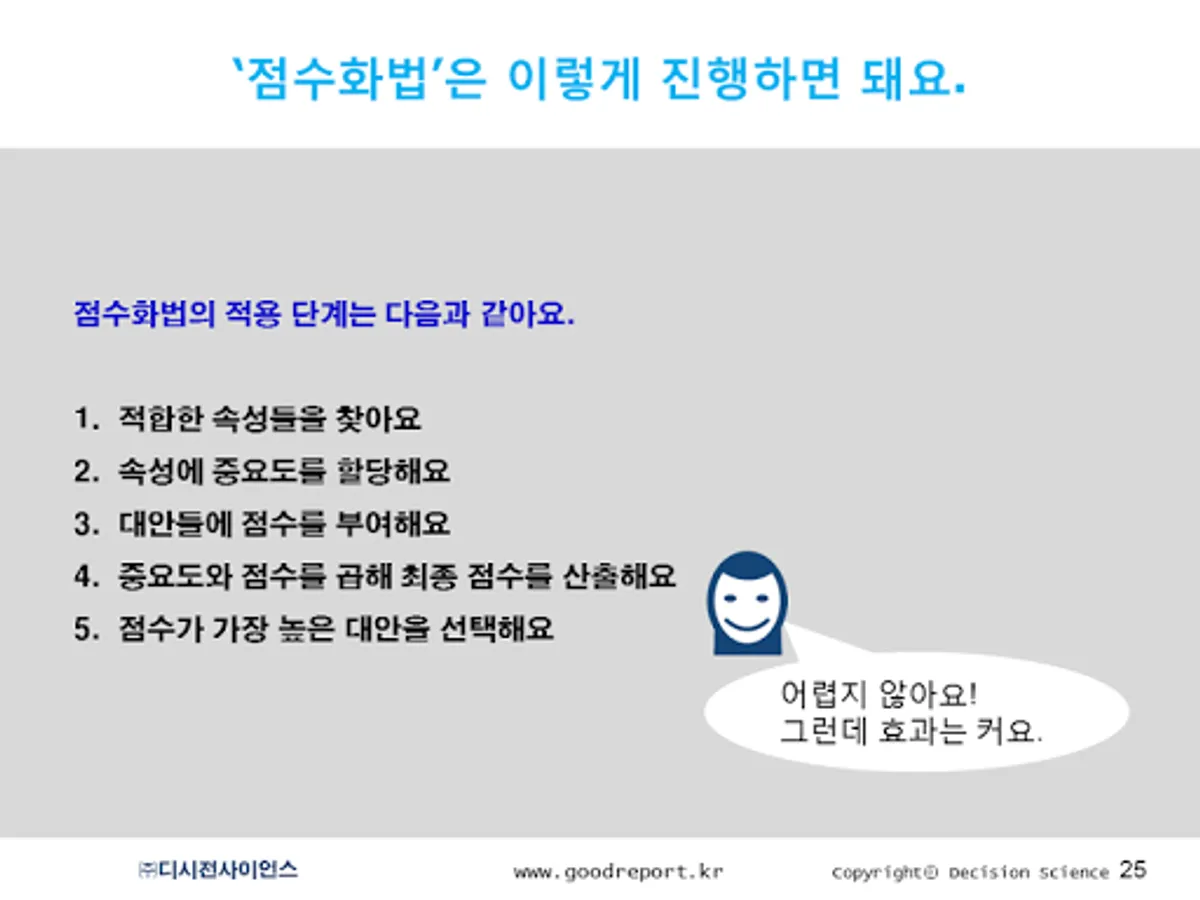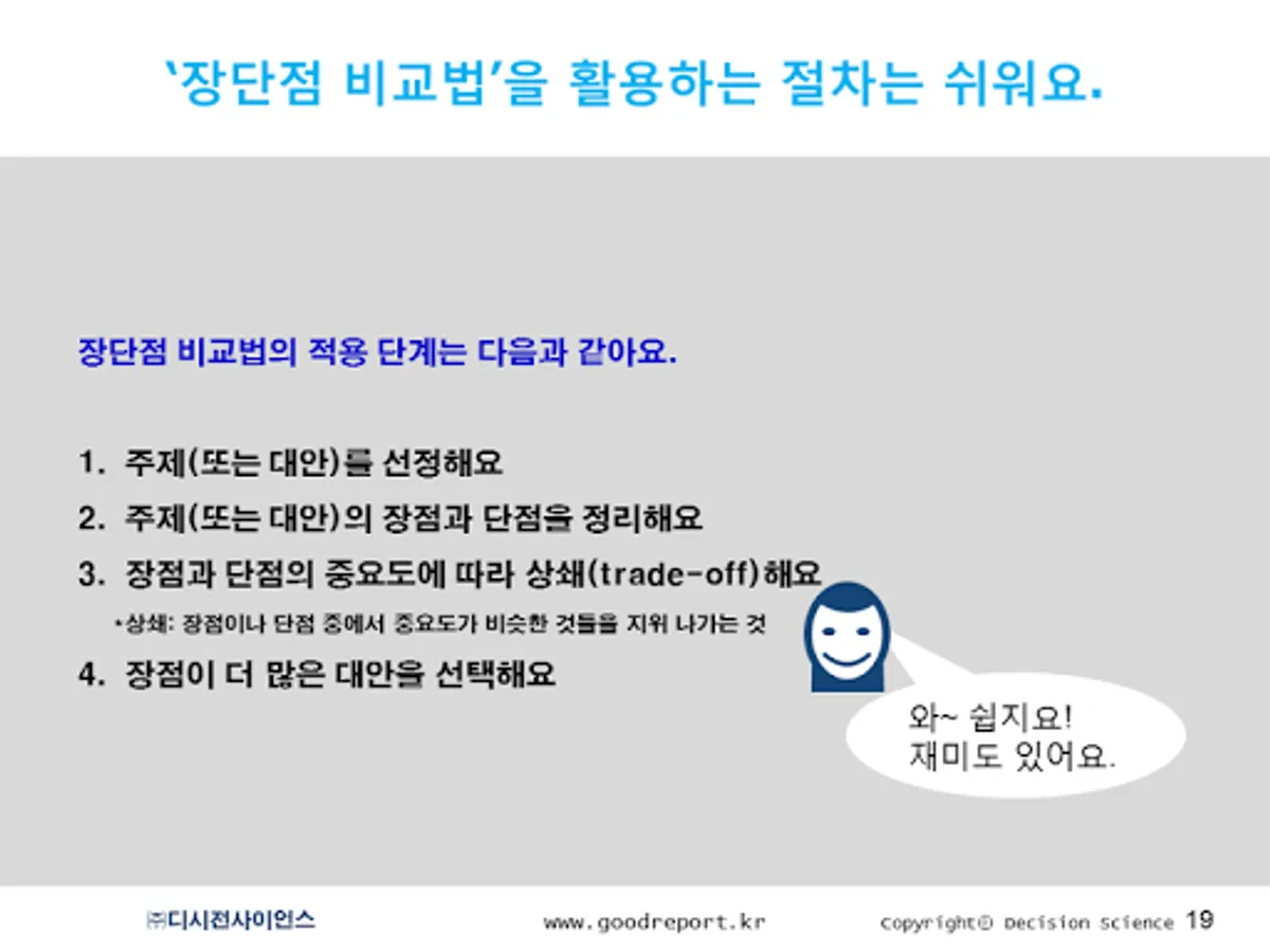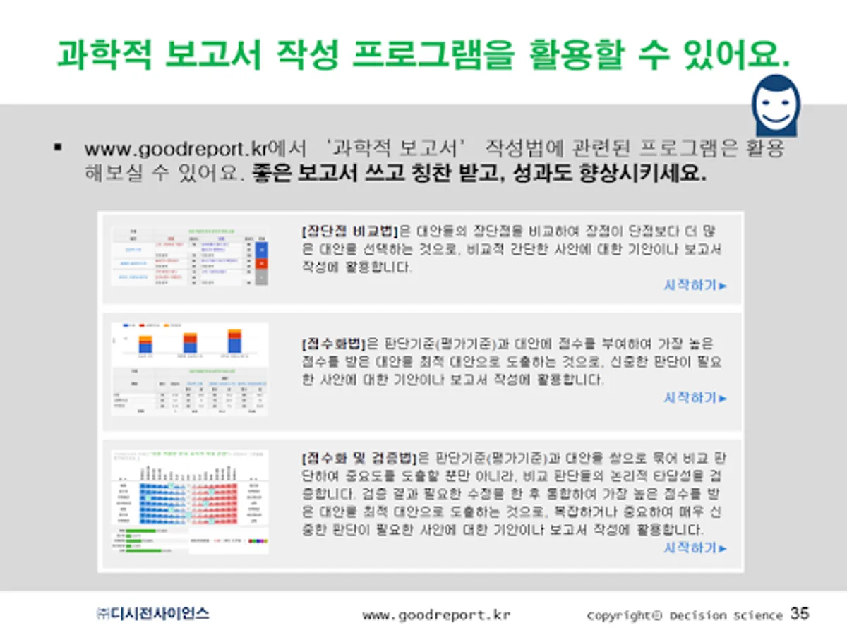 대통령 보고서, 맥킨지 컨설팅 보고서, 삼성형 보고서 등 대표적인 보고서작성법 들의 핵심 내용을 한눈에 살펴볼 수 있습니다. 나아가 ‘과학적 보고서 작성법’을 익혀 한 차원 높은 보고서를 작성하여 칭찬도 받고 성과도 높일 수 있도록 지원합니다. 직장인 여러분, 힘내세요!