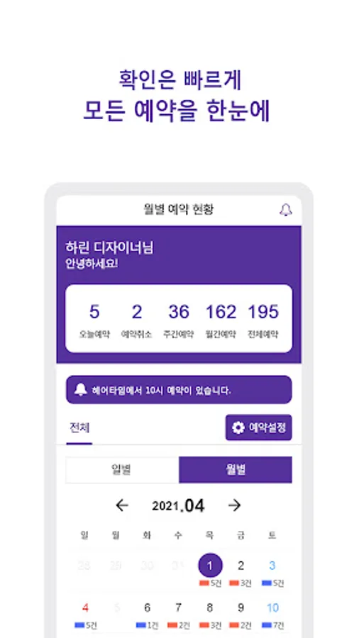 You can easily check and manage your reservations by month/day/hour with the Hairtime app.