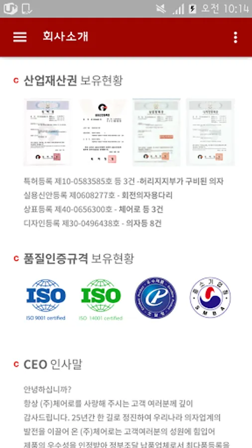 -CEO Greetings and the company that owns industrial property rights, which are described quality certification standards.