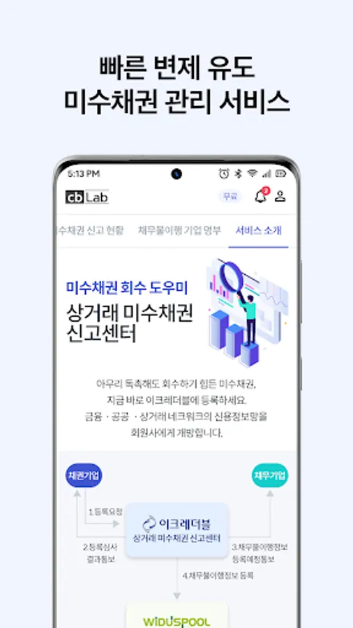 * Receivables receivables management service Register receivables to induce quick repayment Notify debtor company overdue details to major credit inquiry channels (evaluation/private company/financial institution) Applied to credit rating calculation, partner registration and bidding review