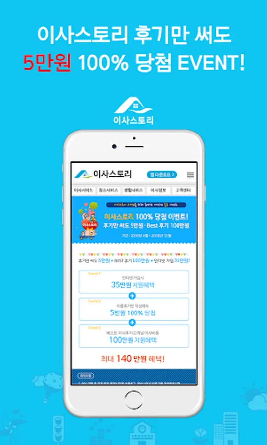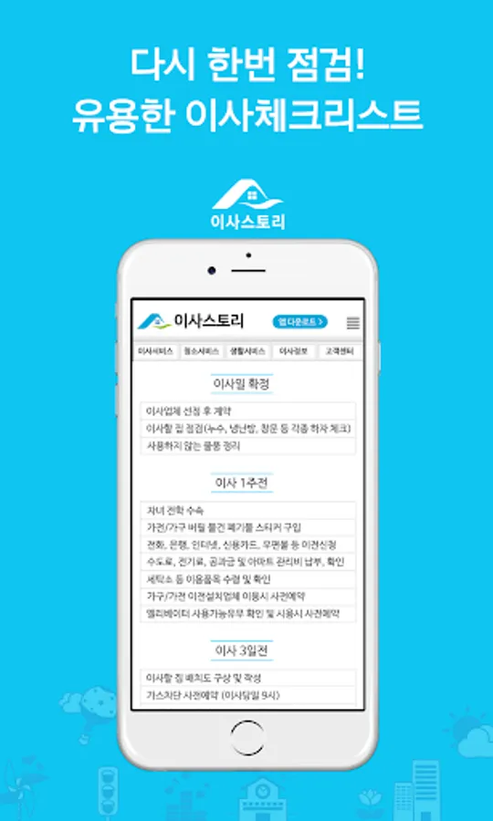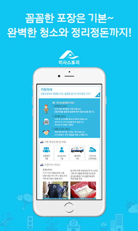 이사스토리 어플은 가정, 일반, 사무실, 원룸 이사서비스 뿐만 아니라, 입주청소 또는 이사청소 까지 무료견적 신청을 받을 수 있습니다. 손 없는 날, 이사준비체크리스트도 확인하실 수 있습니다. App에 들어오셔서 어떤 서비스가 있는지 확인을 해보신다면 더 좋지 않을까요???