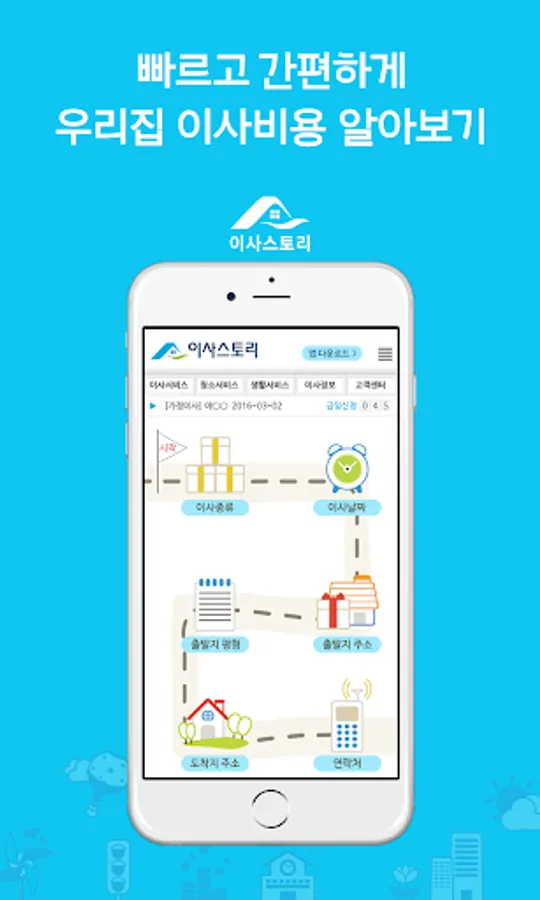 이사를 준비하시는 많은 고객님들이 직방, 다방, 한방, 피터팬의좋은방구하기, 네이버부동산, 다음부동산, 부동산114, 아파트실거래가 등 다양한 국내 부동산어플들을 사용하고 계십니다. 이사스토리는 이사비용계산기 기능을 탑재하여 타 어플들과 차별화된 서비스를 제공해드리고 있습니다. 가장 궁금한 우리집 이사비용 미리 예상비용을 알아볼 수 없을까? 생각하셨던분들에게 필수인 이사스토리 어플! 단 1분이면 충분합니다. 이사날짜(손없는날 확인), 출발지 주소, 출발지 면적(평형), 도착지 주소, 특수이삿짐여부를 간단한 터치방식으로 선택 해주시면 예상이사비용을 바로 알려드립니다. 더이상 속아서 하는 바가지 이사는 그만! 이사비용계산기를 이용해 우리집 예상이사비용 알아보시고 거품없는 경제적인 이사 진행을 도와드립니다.