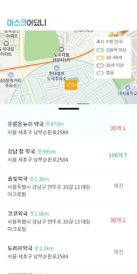 – Location: Public mask sales based on the user's current location Pharmacy / mask inventory status displayed on the map
