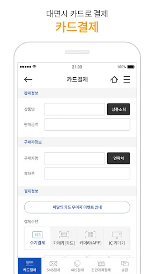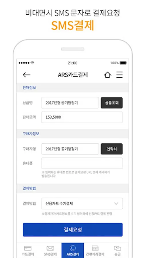 - A payment request (billing) text is sent to the customer's smartphone, and the customer can pay by card in the mobile payment window