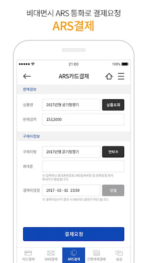 - A payment request (billing) text message is sent to the customer's mobile phone, and the customer can pay by card from the mobile phone to ARS