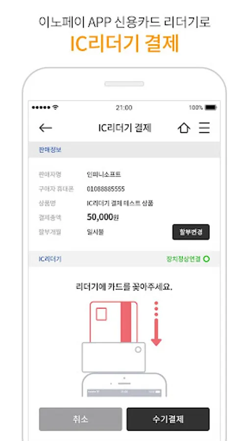 - Instant credit card payment by manually inputting the customer's card information on the InnoPay app screen