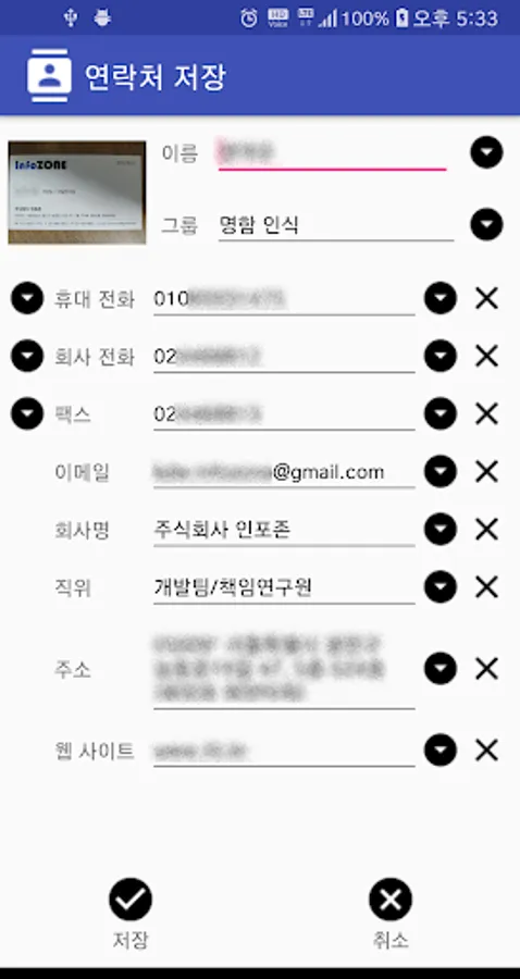 - The summary of the recognized business card is displayed and you can check the contents of the business card immediately.