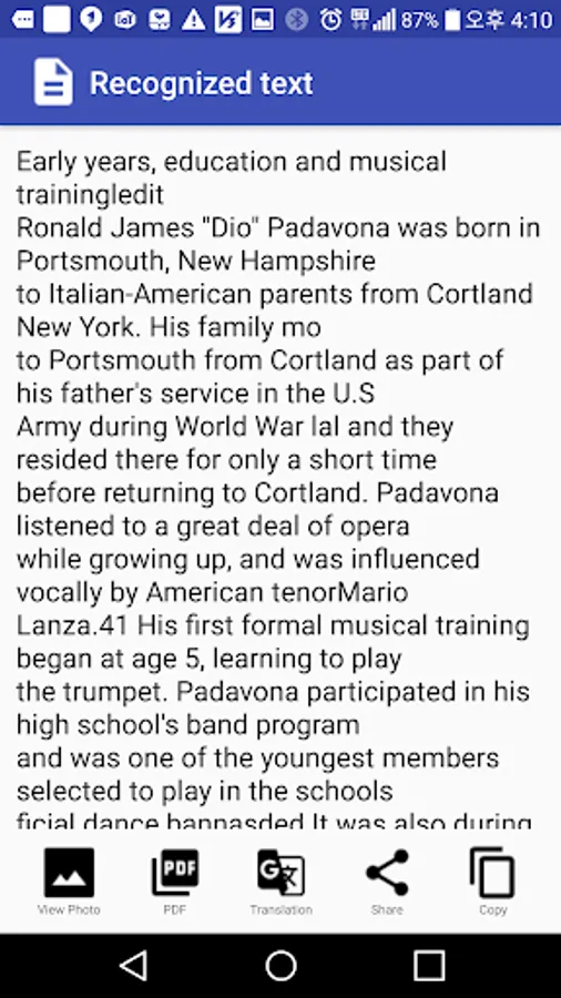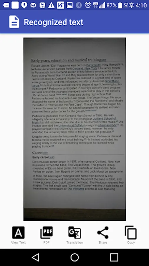 - Copy the recognized text to the clipboard and paste it into the document editor app.
