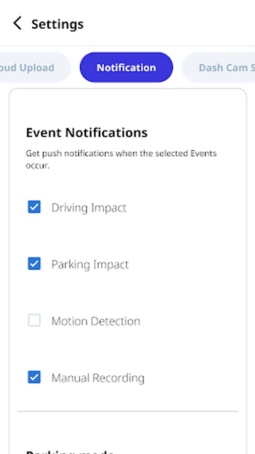 • Event Push Notifications: Get push notifications on your phone whenever the dash cam detectes an impact or motion around your dash cam during parking