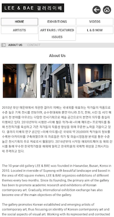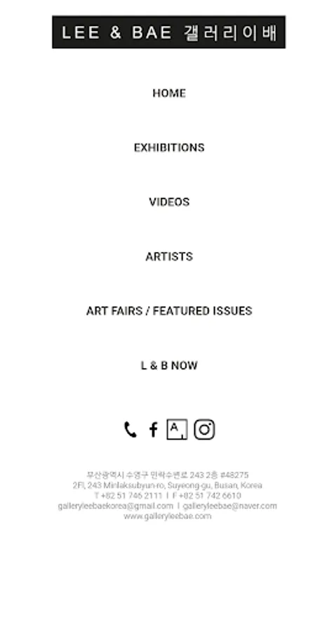 The Gallery Lee & Bae represents a select group of emerging and established artists. The gallery has maintained a strong commitment to introducing cutting-edge art to Busan by Lee & Bae Young Artists program as well as representing artists of earlier generations whose work is particularly relevant to current trends and ideas. Fostering a continuum between the past and the present, the gallery's curatorial program seeks to reveal the relation between art and the conditions that surround it. The Lee & Bae Morris with preciousness to crafts is based on the spirit of Willam Morris, British thinker and show diverse craftworks, including ceramic art, art glass, woodcrafts, metal works etc. The Lee & Bae ArtLab, the research space of Gallery Lee & Bae, presents archives of more than 7,000 home and foreign artists and plays important roles in making outstanding exhibitions.