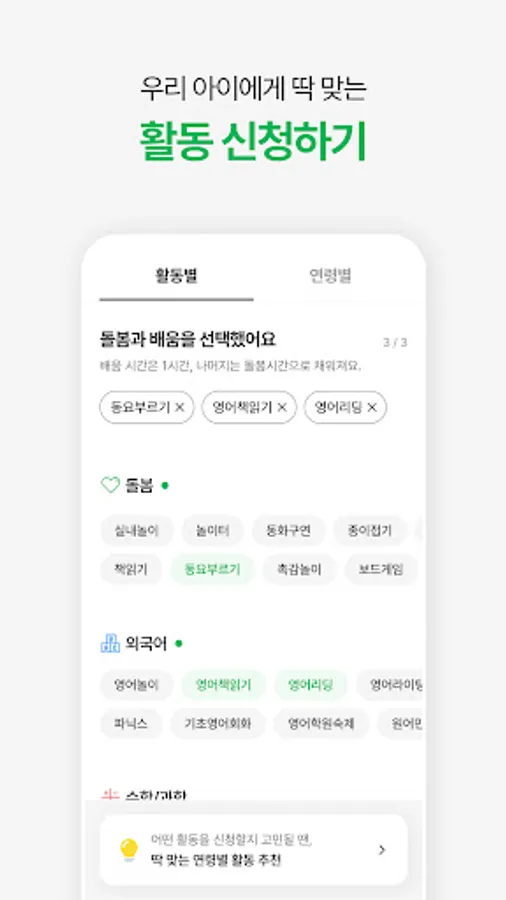 - From infants, toddlers to elementary school students (ages 3 to 13), apply for activities that are suitable for your child's age.