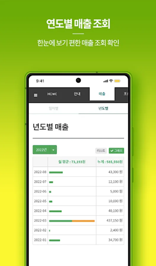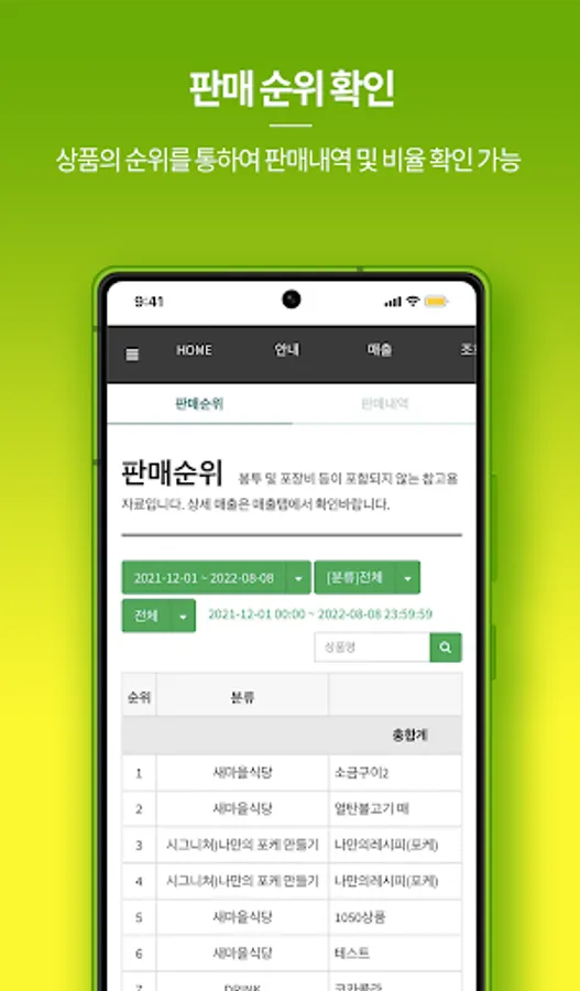 You can easily view the store status and sales, hourly, daily, weekly, yearly sales, settlement.