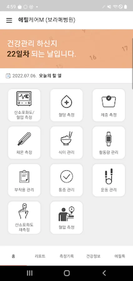 량관리(구글헬스 연동), 부작용, 통증, 운동 등 총 10가지 건강관리 항목 기록 가능