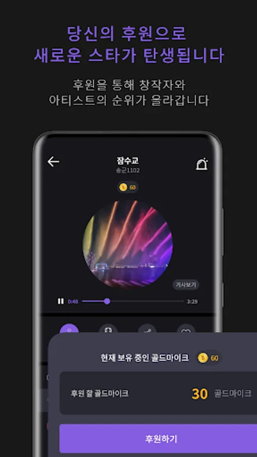 You can support the creator's original song and the singer's recorded song through "Gold Microphone". Through my sponsorship, my favorite original songs and recorded songs can be on the charts.