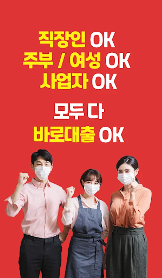 Interest rate: less than 20% per annum / delinquent interest rate: less than 20% per annum / handling fee, other incidental expenses X / no prepayment conditions such as early repayment commission rate / repayment period: minimum 12 months ~ maximum 100 months / maximum annual interest rate is 20% . All products advertised on this site have a repayment period of more than 60 days, with a maximum annual interest rate of 20%. Here is an example loan total cost: When borrowing KRW 1,000,000 at 20% interest for 12 months with a maximum annual interest rate of 20%, the total repayment amount: KRW 1,108,333 (It may vary depending on the loan product.) If the principal and interest to be paid for a certain period is overdue, the contract will expire. You may be obligated to repay all principal and interest before you do so. General financial consumers have the right to receive adequate explanations from financial sellers, and after understanding the explanations, please read the financial product description and terms and conditions before entering into a contract or financial product.