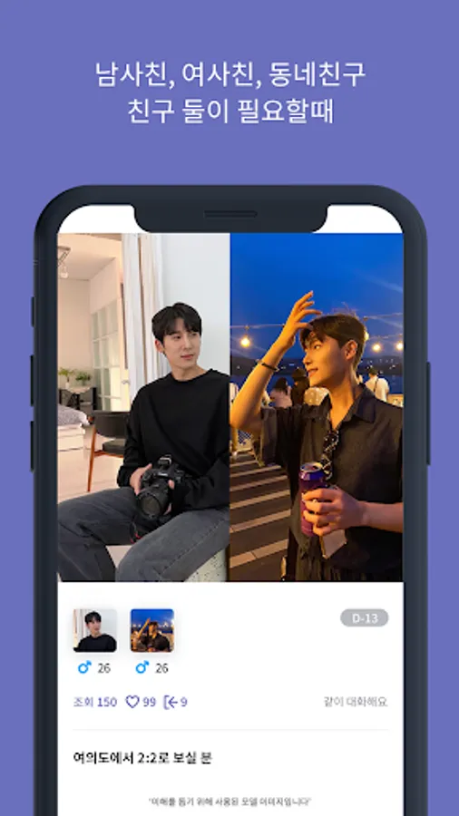 You can find two friends to share in activities that are difficult to do alone (meetings, studies, restaurants, gatherings, travel, games, movies, cafes, karaoke, etc.).