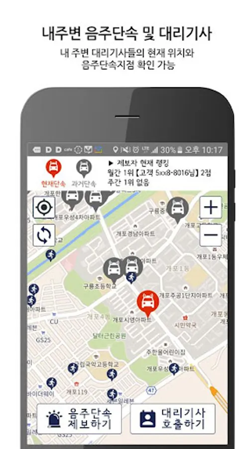 1.내 주변 대리기사들의 실시간 위치를 확인하고 대리를 부를 수 있습니다.