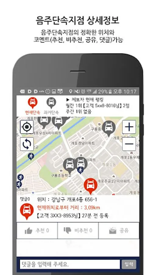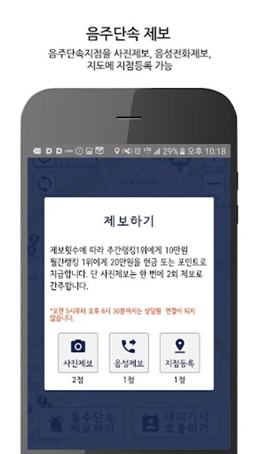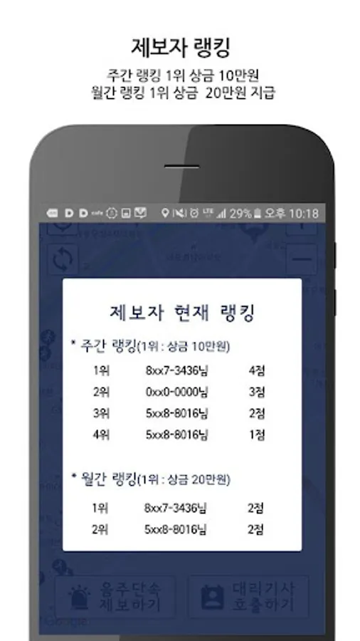 5.누구든지 음주단속지점을 등록하여 공유할 경우, 주간랭킹 및 월간랭킹에 따라 한달에 최고 30만원(주간랭킹1위 10만원, 월간랭킹1위 20만원)의 상금을 매달 지급합니다.