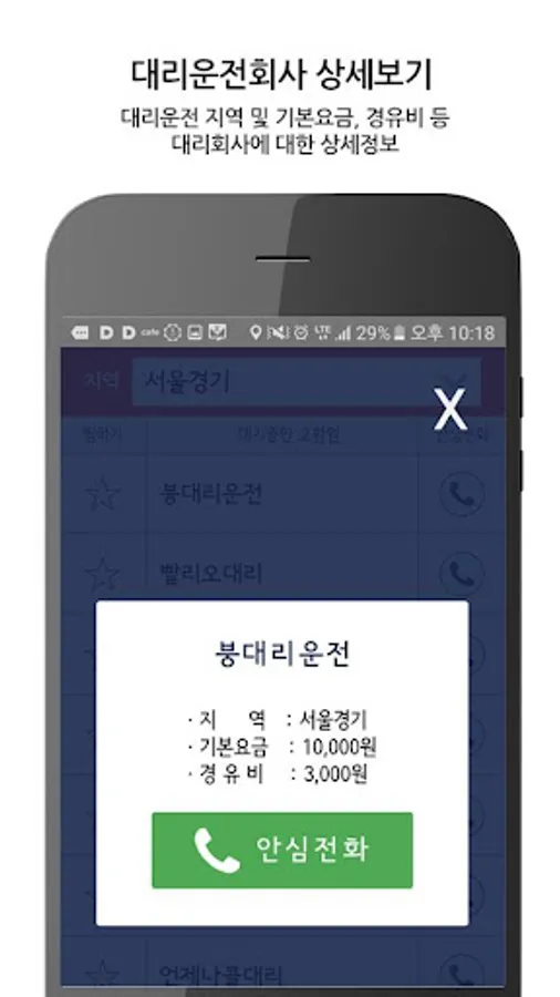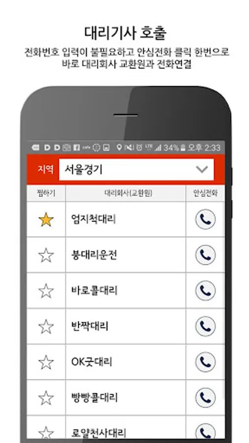 3.대리회사들의 전화번호를 몰라도 앱에 나와 있는 안심전화 아이콘을 클릭하면 즉시 대리회사 교환원에게 전화연결이 됩니다.